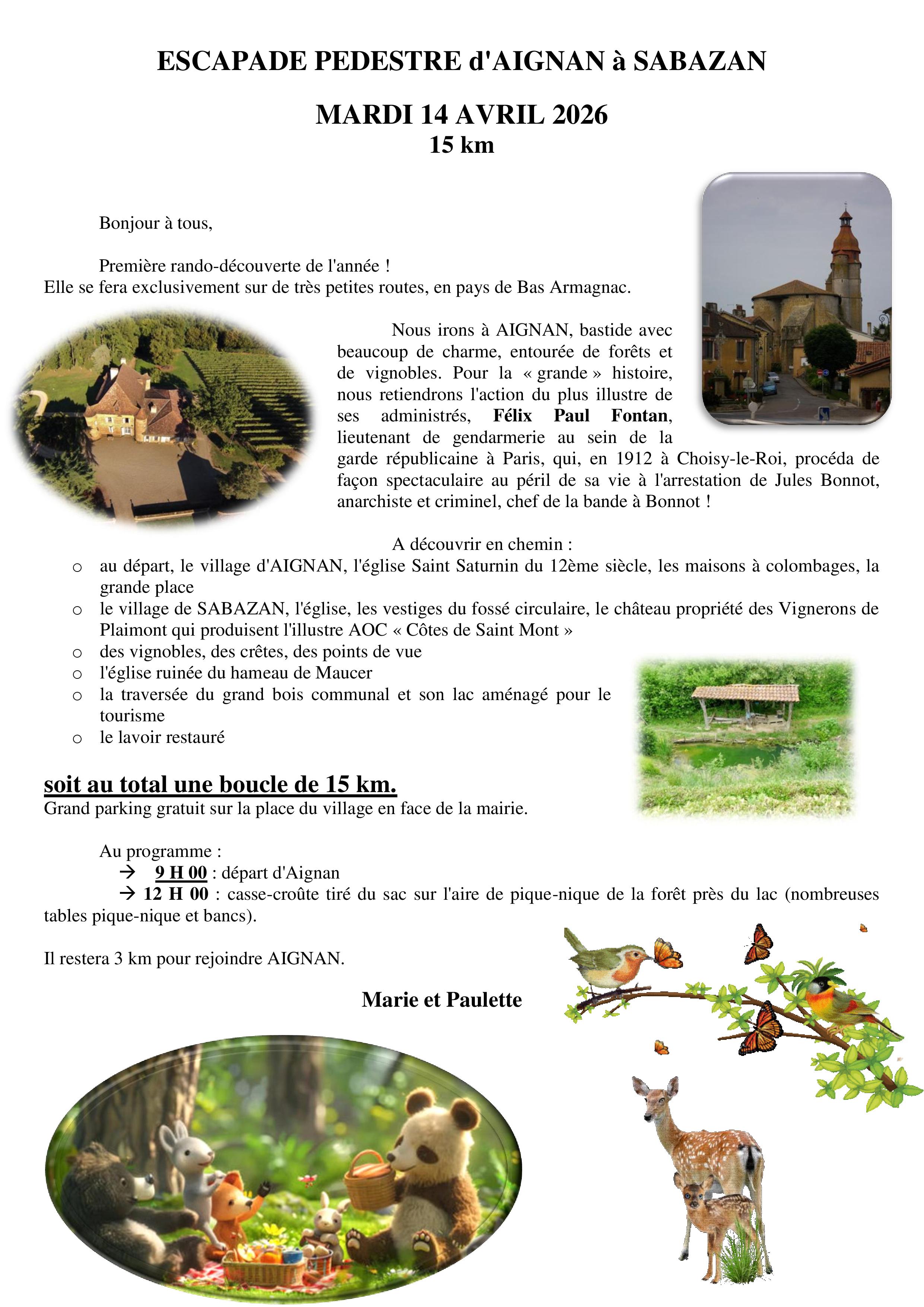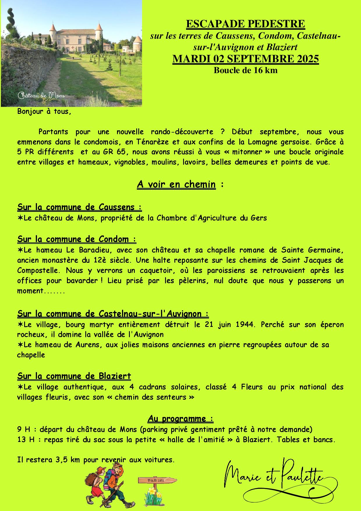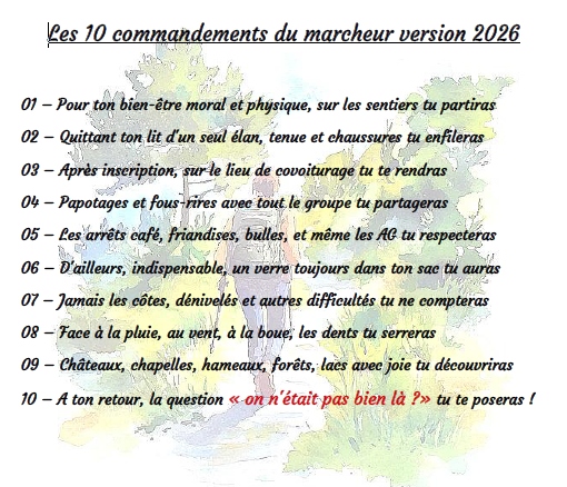 Les 10 commandements 2024..... 01 - Sans rechigner, de bon matin te lèveras 02 - Tes amis, sur le sentier proposé retrouveras 03 - Aux coups de sifflet, sur le côté te rangeras 04 - Si trop de boue ou de la pluie, rien ne diras 05 - si trop de côtes, jamais ne te plaindras 06 - dans ton sac à dos, un verre en permanence auras 07 - le numéro de téléphone du responsable enregistreras 08 - de bonne humeur et rieur toujours seras 09 - de nouvelles et belles marches, parfois proposeras 10- d’être dans ce groupe sympa et bon enfant, te réjouiras  Bonne et belle année à chacun d’entre vous, en espérant en partager quelques moments sur les chemins tous ensemble. Marie |